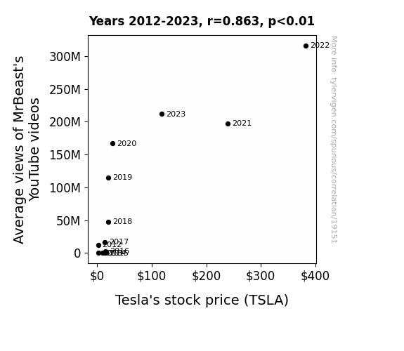 This means 74.5% of the change in the one variable (i.e., Tesla's stock price (TSLA)) is predictable based on the change in the other (i.e., Average views of MrBeast's YouTube videos) over the 12 years from 2012 through 2023.