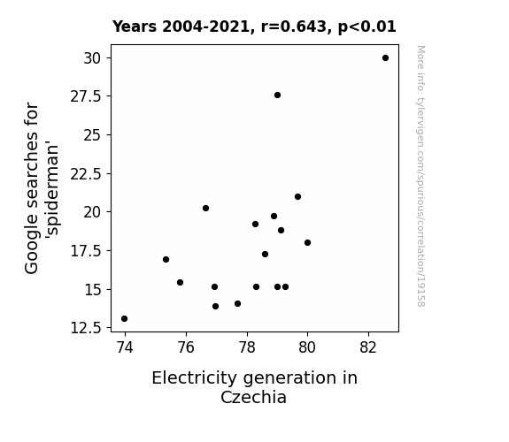 This means 41.4% of the change in the one variable (i.e., Electricity generation in Czechia) is predictable based on the change in the other (i.e., Google searches for 'spiderman') over the 18 years from 2004 through 2021.