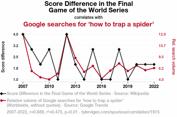 User prompt: Please provide potential search keywords for a paper titled Spidey Scores: The Surprising Connection Between World Series Score Difference and Arachnid Traps with an abstract of This paper investigates the curious relationship between the score difference in the final game of the World Series and Google searches for 'how to trap a spider'. Drawing from data obtained from Wikipedia and Google Trends, the research team conducted an analysis covering the years 2007 to 2022. The study found a striking correlation coefficient of 0.6888648 and a statistically significant p-value of less than 0.01, indicating a high likelihood that the observed relationship is not due to random chance. The unexpected link between baseball game outcomes and spider-trapping inquiries raises intriguing questions about the human psyche and the quirky interplay between seemingly unrelated phenomena. This research sheds light on the quirkier side of human behavior and the peculiar ways in which our interests may be influenced by seemingly unrelated external factors.