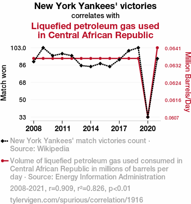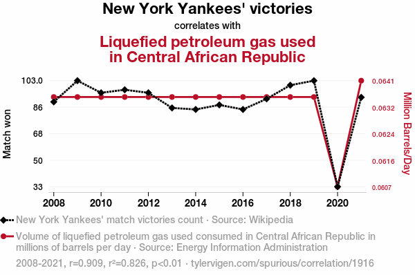 A linear line chart with years as the X-axis and two variables on the Y-axis. The first variable is New York Yankees' victories and the second variable is Liquefied petroleum gas used in Central African Republic.  The chart goes from 2008 to 2021, and the two variables track closely in value over that time. Small Image