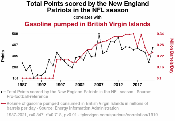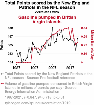 - The spurious research paper: Fueling the Score: Exploring the Curious Correlation Between New England Patriots' Total Points and Gasoline Consumption in the British Virgin Islands