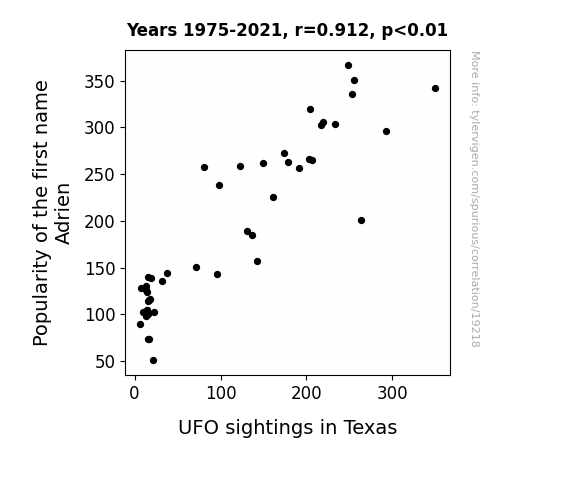 This means 83.1% of the change in the one variable (i.e., UFO sightings in Texas) is predictable based on the change in the other (i.e., Popularity of the first name Adrien) over the 47 years from 1975 through 2021.