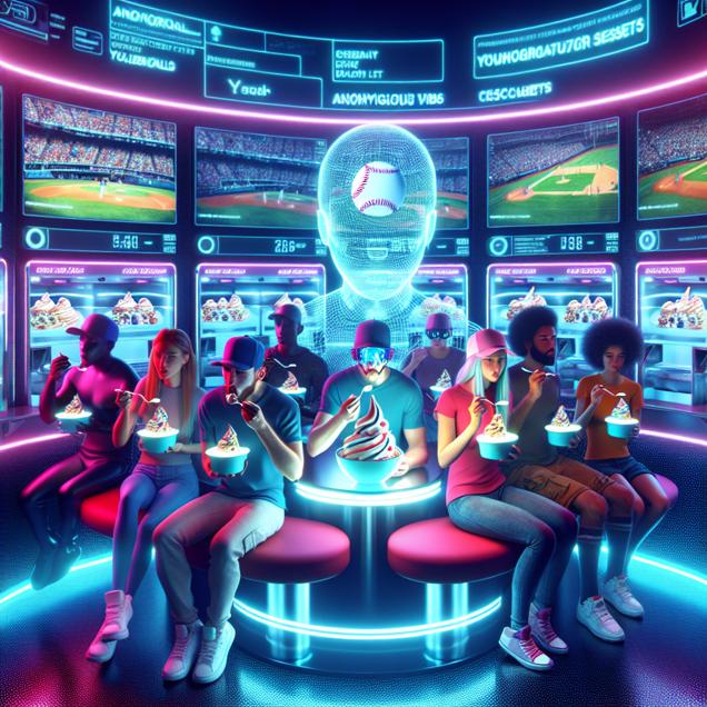 Prompt: Generate a surreal cyber art representation of a group of baseball fans inside a futuristic yogurt bar, surrounded by holographic ticket kiosks displaying Washington Nationals games. The fans are depicted enjoying their yogurt treats, their expressions exuding anticipation and excitement. The scene is illuminated by neon lights and techno-infused visuals, evoking a sense of digital wonder and anticipation for the game. The depiction should include only scenes, people, and objects, it should not include text or speech bubbles.