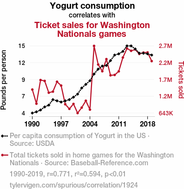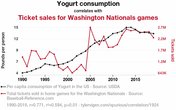 A linear line chart with years as the X-axis and two variables on the Y-axis. The first variable is Yogurt consumption and the second variable is Ticket sales for Washington Nationals games.  The chart goes from 1990 to 2019, and the two variables track closely in value over that time. Small Image