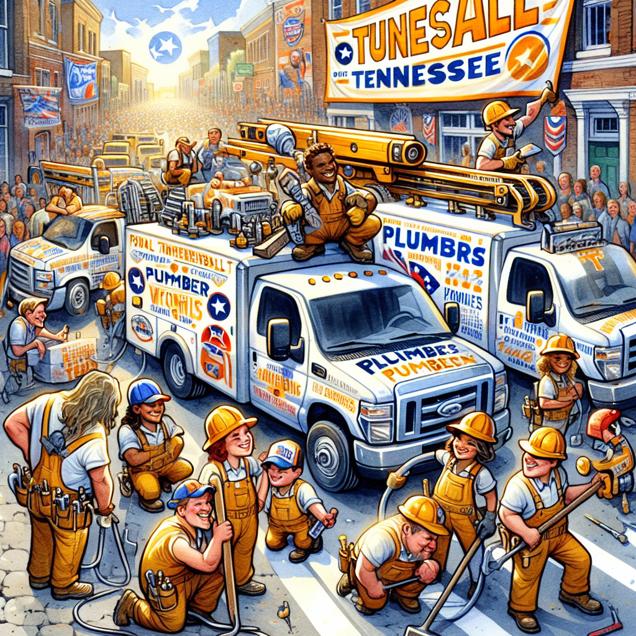 Prompt: Generate an image inspired by the bustling streets of Tennessee. Show several plumbers with their trucks parked on the street, each proudly adorned with the Tennessee Titans logo. Also, include a banner displaying the number of season wins for the Tennessee Titans. The scene should be filled with a sense of community and pride, with a nod to the football team's influence on the local environment. Be sure to capture the vibrant energy of the street and the connection between the local businesses and the beloved sports team. The depiction should include only scenes, people, and objects, it should not include text or speech bubbles.