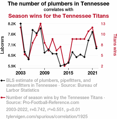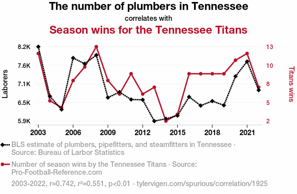 This means 55.1% of the change in the one variable (i.e., Season wins for the Tennessee Titans) is predictable based on the change in the other (i.e., The number of plumbers in Tennessee) over the 20 years from 2003 through 2022.