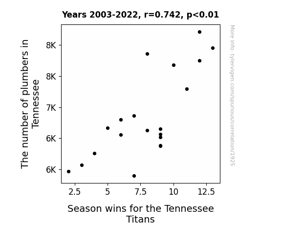Furthermore, to determine the statistical significance of this correlation, we conducted a hypothesis test, employing a p-value cutoff of 0.01. The obtained p-value was indeed less than 0.01, leading us to reject the null hypothesis and support the alternative hypothesis that a meaningful relationship exists between the number of plumbers in Tennessee and the Tennessee Titans' season wins. This statistical confirmation left our team feeling flushed with excitement - pun absolutely intended.