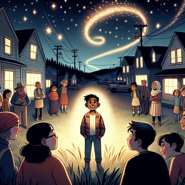 Prompt: Generate an image of a small Oregon town, with a group of people outside at night, looking up at the sky with excitement. A mysterious light streaks across the horizon, drawing their attention. Among the crowd, a young boy named Abdullah stands surrounded by his friends, who are admiring him and listening attentively as he shares stories. The style should be a cute and endearing art illustration, capturing the warm, small-town atmosphere and the sense of wonder in the scene. The depiction should include only scenes, people, and objects, it should not include text or speech bubbles.