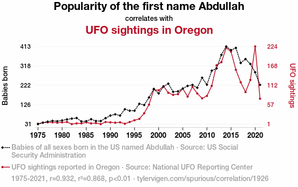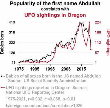 The scatterplot illustrating the relationship between the prevalence of the name Abdullah and the frequency of UFO sightings in Oregon (Fig. 1) underscores the strong positive correlation observed in the data.