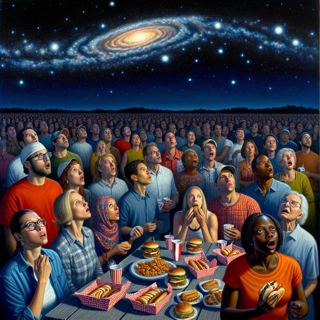 Prompt: Generate an image showing a surreal scene where a crowd of Mississippi residents congregate outside at night, gazing up in awe at a radiant, unidentified object hovering in the starry sky. Meanwhile, at a bustling outdoor event nearby, the reigning Nathan's Hot Dog Eating Competition Champion voraciously devours a multitude of hotdogs at an astonishing speed, amid an audience of onlookers. The composition should convey a sense of wonder and surreal juxtaposition, where the extraordinary and the mundane coexist in a visually compelling manner. The depiction should include only scenes, people, and objects, it should not include text or speech bubbles.