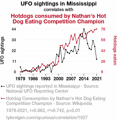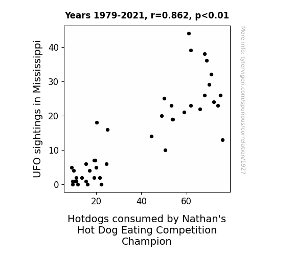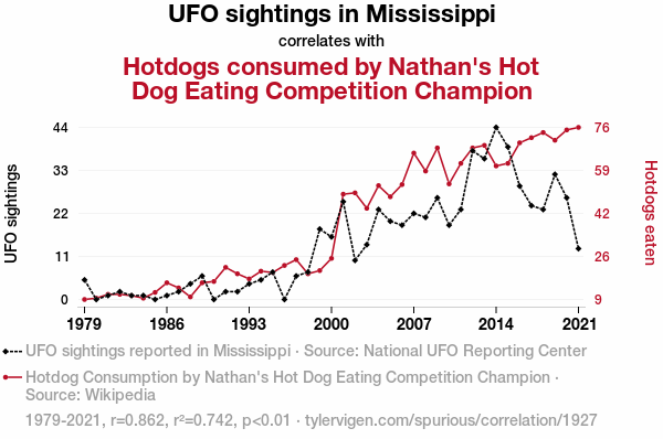 Unidentified Flying Objects, UFO sightings, hotdogs, Nathan's Hot Dog Eating Competition, correlation study, Mississippi, National UFO Reporting Center, Wikipedia, celestial sightings, interplay, relationship, statistical significance, correlation coefficient, p-value, 1979-2021