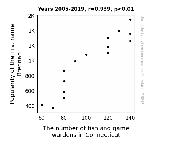This means 88.1% of the change in the one variable (i.e., The number of fish and game wardens in Connecticut) is predictable based on the change in the other (i.e., Popularity of the first name Brennan) over the 15 years from 2005 through 2019.