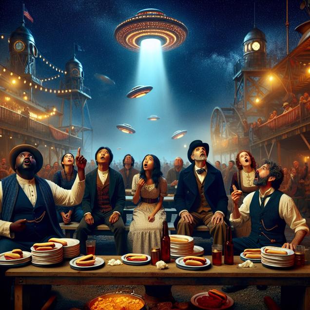 ChatGPT: [ Steampunk ] Create an image of a steampunk-inspired scene where a group of people in Utah are in awe as they gaze up at the night sky, pointing and gasping, while a glowing UFO flies overhead. In the same scene, capture a bustling competition where the Nathan's Hot Dog Eating Champion proudly stands surrounded by empty hot dog trays, having consumed an impressive stack of hot dogs, all within a steampunk-themed setting.