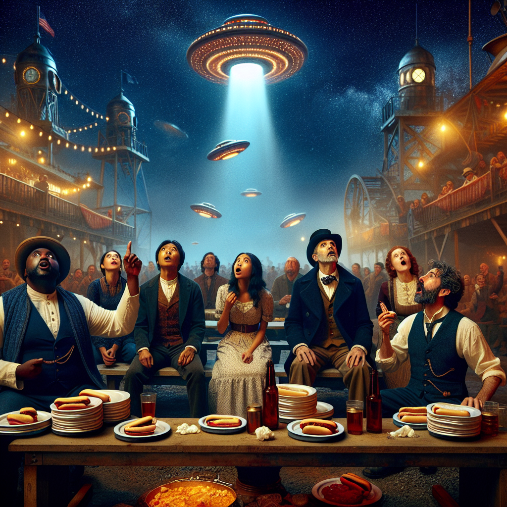 Prompt: [ Steampunk ] Create an image of a steampunk-inspired scene where a group of people in Utah are in awe as they gaze up at the night sky, pointing and gasping, while a glowing UFO flies overhead. In the same scene, capture a bustling competition where the Nathan's Hot Dog Eating Champion proudly stands surrounded by empty hot dog trays, having consumed an impressive stack of hot dogs, all within a steampunk-themed setting. The depiction should include only scenes, people, and objects, it should not include text or speech bubbles.