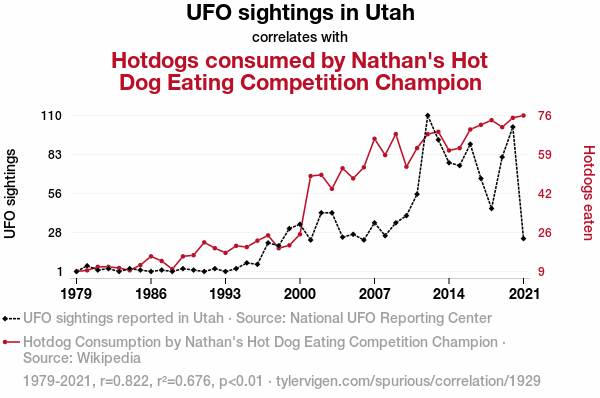 User prompt: Please make up a funny explanation for how an increase in UFO sightings in Utah caused Hotdogs consumed by Nathan's Hot Dog Eating Competition Champion to increase.