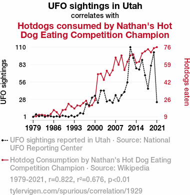 This means 67.6% of the change in the one variable (i.e., Hotdogs consumed by Nathan's Hot Dog Eating Competition Champion) is predictable based on the change in the other (i.e., UFO sightings in Utah) over the 43 years from 1979 through 2021.
