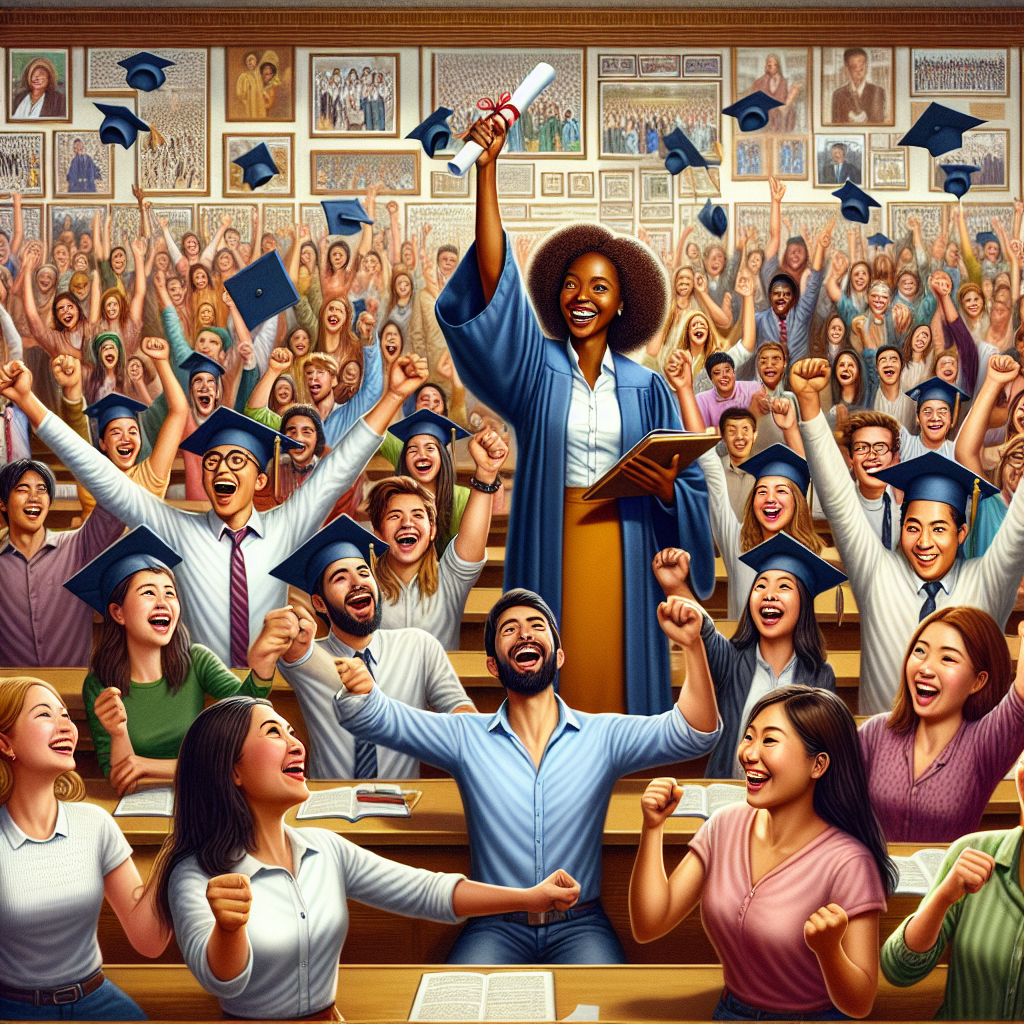 User prompt: Please respond with an image generation prompt that would be likely to create an interesting visual using DALLE-3, using the following style: [ Photorealism ] and depicting this scene: In a crowded college classroom, standing at the front of the room is a smiling teacher with a diploma in hand, surrounded by a group of cheering students holding banners that read "Brennon" in bold letters. The walls are adorned with illustrations of graduation caps to symbolize the popularity of the name Brennon and the successful completion of associate's degrees in Education. Keep the visual depiction simple. Do not include any words or speech bubbles.