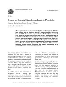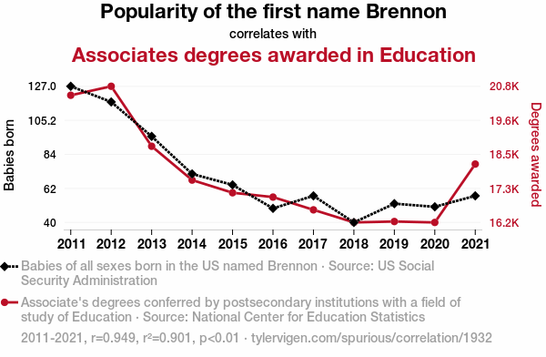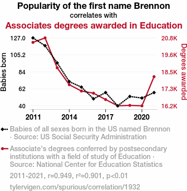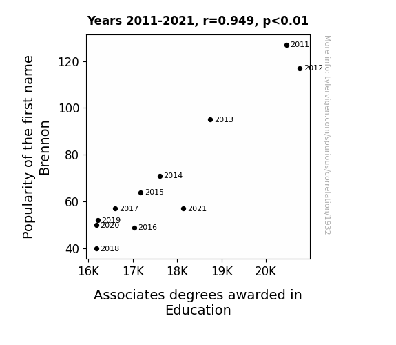 User prompt: Please provide potential search keywords for a paper titled Brennon and Degrees of Education: An Unexpected Association with an abstract of This study investigates the peculiar relationship between the popularity of the first name Brennon and the number of associate's degrees awarded in the field of Education. While this connection may seem far-fetched at first glance, our research team delved into the data from the US Social Security Administration and the National Center for Education Statistics to uncover surprising findings. Utilizing statistical analysis, we calculated a correlation coefficient of 0.9490169 and p < 0.01 for the period spanning 2011 to 2021. The results suggest a remarkably strong positive correlation between the trends in the popularity of the name Brennon and the number of associate's degrees conferred in Education. This unexpected association warrants further investigation and prompts contemplation of the potential influence of a name on academic pursuits.