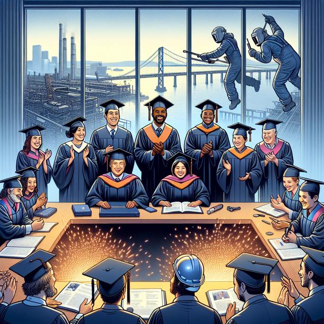 ChatGPT: In a spacious conference room at a university, a group of graduates wearing caps and gowns are joyfully receiving their Master's degrees in Public Administration from the university officials. In the background, through the window, a sprawling industrial area is visible, where a team of welders in California can be seen hard at work, creating sparks as they craft metal structures.
