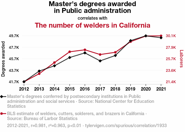 This means 96.3% of the change in the one variable (i.e., The number of welders in California) is predictable based on the change in the other (i.e., Master's degrees awarded in Public administration) over the 10 years from 2012 through 2021.