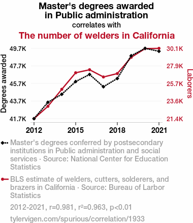 User prompt: Please make up a funny explanation for how an increase in Master's degrees awarded in Public administration caused The number of welders in California to increase.\Make it sound serious until the end.