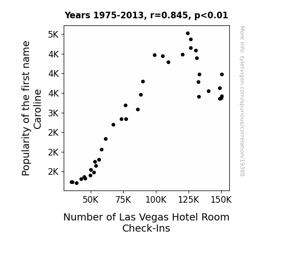 This means 71.3% of the change in the one variable (i.e., Number of Las Vegas Hotel Room Check-Ins) is predictable based on the change in the other (i.e., Popularity of the first name Caroline) over the 39 years from 1975 through 2013.