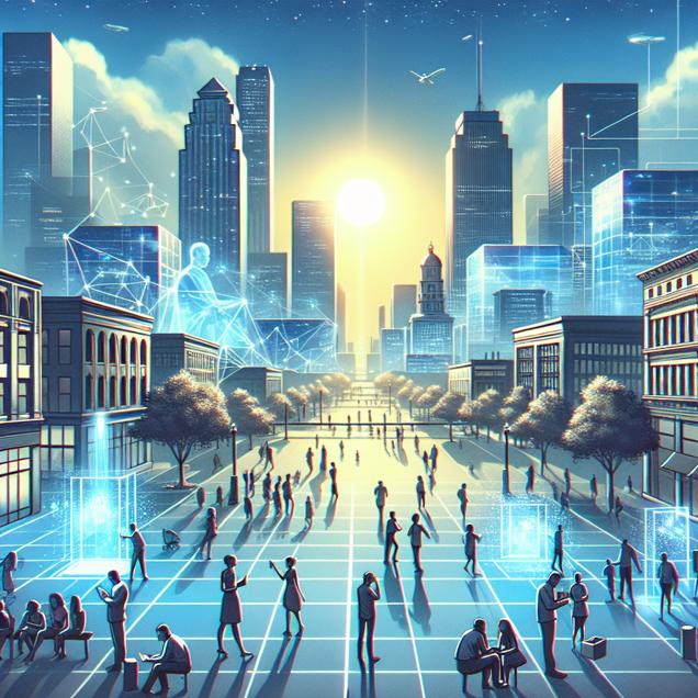 Prompt: Generate an image of a high-tech future cityscape in Iowa City. The sky is a vibrant blue, with wispy white clouds and a bright sun shining down. The city is modern and clean, with sleek buildings and advanced infrastructure. People in small groups are gathered outdoors, engaged in animated discussions. Some individuals are seen typing on futuristic devices, with holographic displays projecting above them. The air is crisp and fresh, with a sense of renewed energy and openness. The scene hints at conspiracy theories and a quest for information, evoking a high-tech atmosphere of curiosity and intrigue. The depiction should include only scenes, people, and objects, it should not include text or speech bubbles.