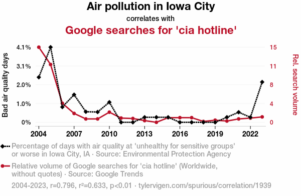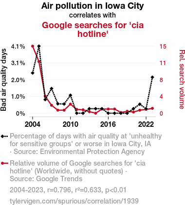 - The spurious research paper: Air Pollucia-tion: Exploring the Link Between Air Pollution in Iowa City and Google Searches for 'CIA Hotline'