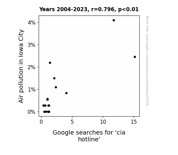This means 63.3% of the change in the one variable (i.e., Google searches for 'cia hotline') is predictable based on the change in the other (i.e., Air pollution in Iowa City) over the 20 years from 2004 through 2023.