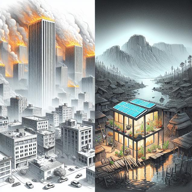 Prompt: Create an image that embodies the contrast between environmental challenges and sustainable solutions. In a scene of Helena, Montana shrouded in hazy smoke from wildfires, showcase a brutalist architectural structure with a sense of weathered resilience. In contrast, depict a simple, rural setting in Benin with a small, vibrant solar panel generating sustainable energy amidst the community. Capture the stark difference in environmental impact and the hopeful promise of renewable energy. The depiction should include only scenes, people, and objects, it should not include text or speech bubbles.
