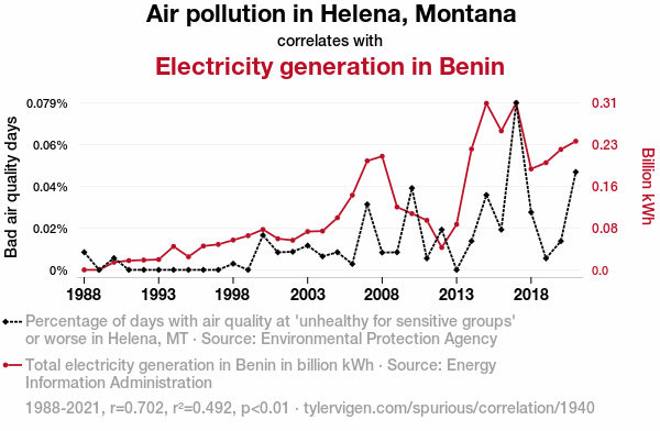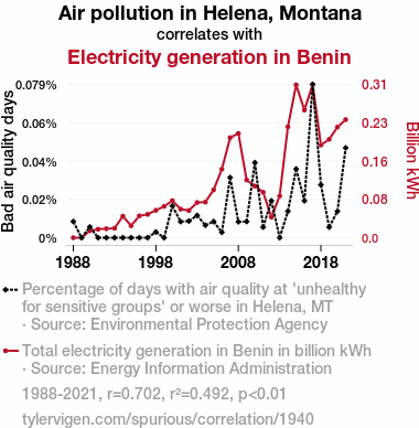 This means 49.2% of the change in the one variable (i.e., Electricity generation in Benin) is predictable based on the change in the other (i.e., Air pollution in Helena, Montana) over the 34 years from 1988 through 2021.