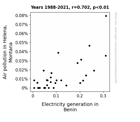The statistical analysis revealed a rather remarkable correlation coefficient of 0.7015194 between air pollution levels in Helena, Montana, and electricity generation in Benin. This positive correlation indicates that as air pollution levels in Helena increased, electricity generation in Benin also exhibited a corresponding increase. In layman's terms, it's as if the fumes from Helena managed to travel across oceans to spur electricity generation in Benin – a true testament to the global interconnectedness of environmental and energy systems.