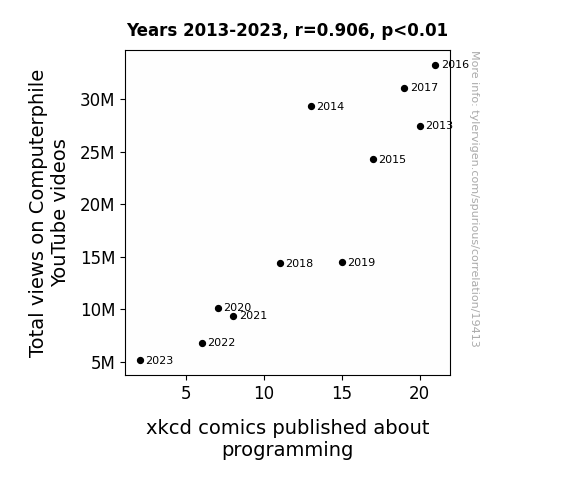 This means 82.1% of the change in the one variable (i.e., xkcd comics published about programming) is predictable based on the change in the other (i.e., Total views on Computerphile YouTube videos) over the 11 years from 2013 through 2023.