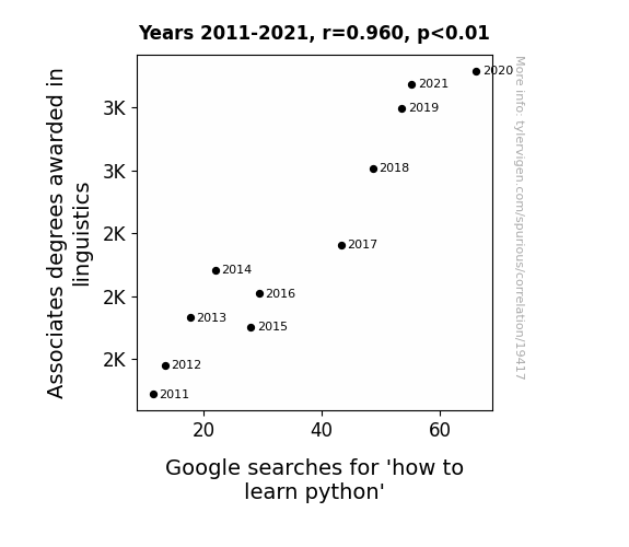 This means 92.1% of the change in the one variable (i.e., Google searches for 'how to learn python') is predictable based on the change in the other (i.e., Associates degrees awarded in linguistics) over the 11 years from 2011 through 2021.