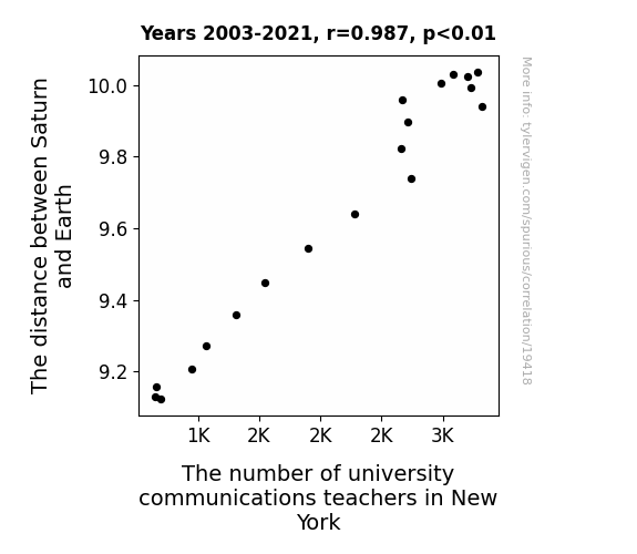 This means 97.3% of the change in the one variable (i.e., The number of university communications teachers in New York) is predictable based on the change in the other (i.e., The distance between Saturn and Earth) over the 19 years from 2003 through 2021.