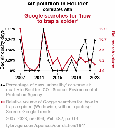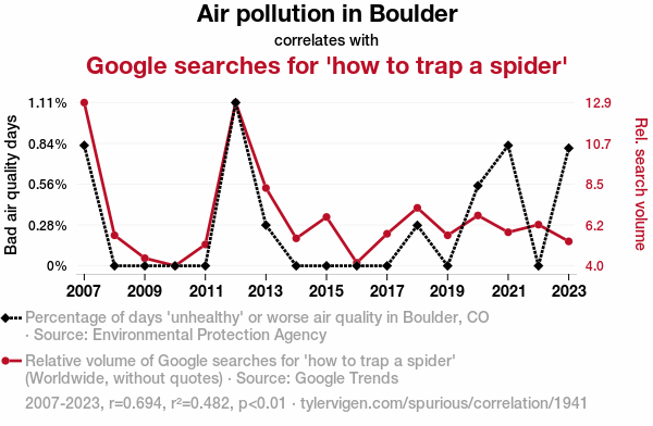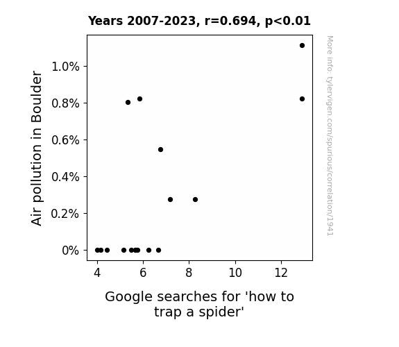 - The spurious research paper: Caught in a Web of Pollution: The Correlation between Air Quality and the Urge to Trap a Spider in Boulder