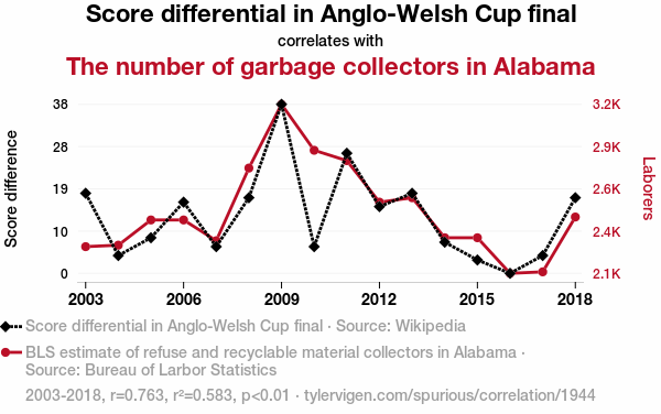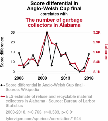 User prompt: Please provide potential search keywords for a paper titled Correlation Between Cup Differential and Collection Crews: Curiously Connected or Coincidence? with an abstract of In this study, we delved into the intriguing relationship between the score differential in the Anglo-Welsh Cup final and the number of garbage collectors in Alabama. Our research team utilized data from Wikipedia and the Bureau of Labor Statistics to meticulously analyze this seemingly odd connection. Our findings revealed a surprising correlation coefficient of 0.7633473 with a p-value less than 0.01 from the years 2003 to 2018. It seems that there may be more to this whimsical correlation than meets the eye.