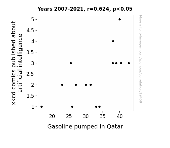 This means 39% of the change in the one variable (i.e., Gasoline pumped in Qatar) is predictable based on the change in the other (i.e., xkcd comics published about artificial intelligence) over the 15 years from 2007 through 2021.
