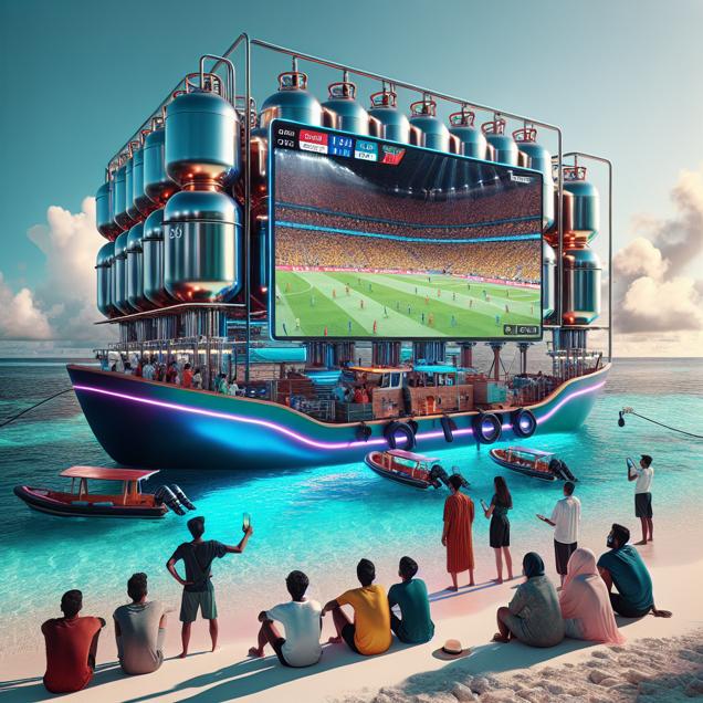 Prompt: Generate an image in the style of [ High-tech ] where a sleek, futuristic fishing boat is anchored along the crystal-clear waters of the Maldives. The boat is adorned with colorful Liquefied petroleum gas tanks neatly stacked on board. In the background, a high-tech screen on the beach displays the thrilling final game of the World Series, with the scoreboard visibly showing the number of games played in the series. A group of people gathers around the cutting-edge display, immersed in the intense game, while the modern equipment and setting emphasize the fusion of traditional activities with advanced technology in this idyllic coastal scene. The depiction should include only scenes, people, and objects, it should not include text or speech bubbles.