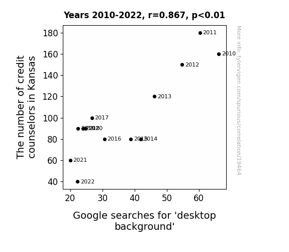 This means 75.1% of the change in the one variable (i.e., Google searches for 'desktop background') is predictable based on the change in the other (i.e., The number of credit counselors in Kansas) over the 13 years from 2010 through 2022.