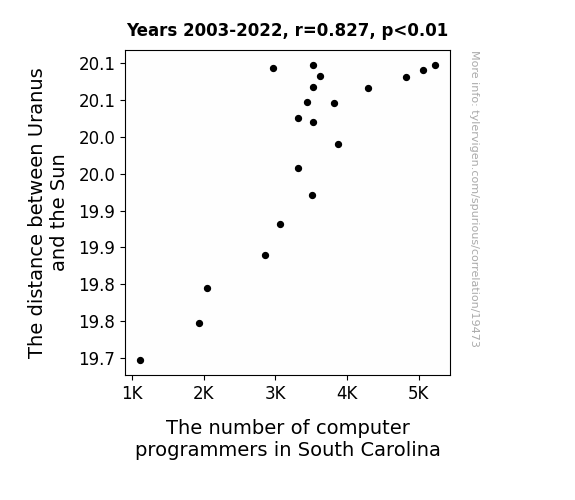 This means 68.4% of the change in the one variable (i.e., The number of computer programmers in South Carolina) is predictable based on the change in the other (i.e., The distance between Uranus and the Sun) over the 20 years from 2003 through 2022.