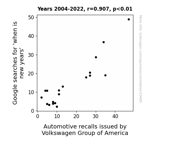 This means 82.3% of the change in the one variable (i.e., Automotive recalls issued by Volkswagen Group of America) is predictable based on the change in the other (i.e., Google searches for 'when is new years') over the 19 years from 2004 through 2022.