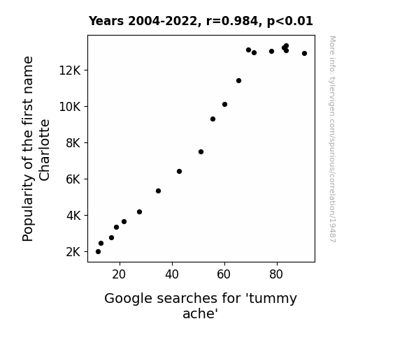 This means 96.8% of the change in the one variable (i.e., Google searches for 'tummy ache') is predictable based on the change in the other (i.e., Popularity of the first name Charlotte) over the 19 years from 2004 through 2022.
