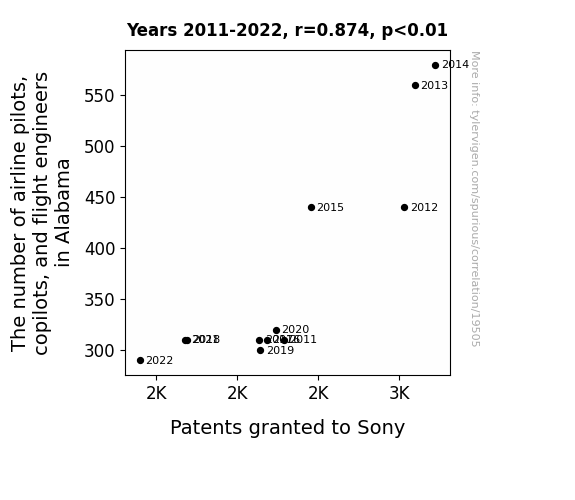 This means 76.4% of the change in the one variable (i.e., Patents granted to Sony) is predictable based on the change in the other (i.e., The number of airline pilots, copilots, and flight engineers in Alabama) over the 12 years from 2011 through 2022.