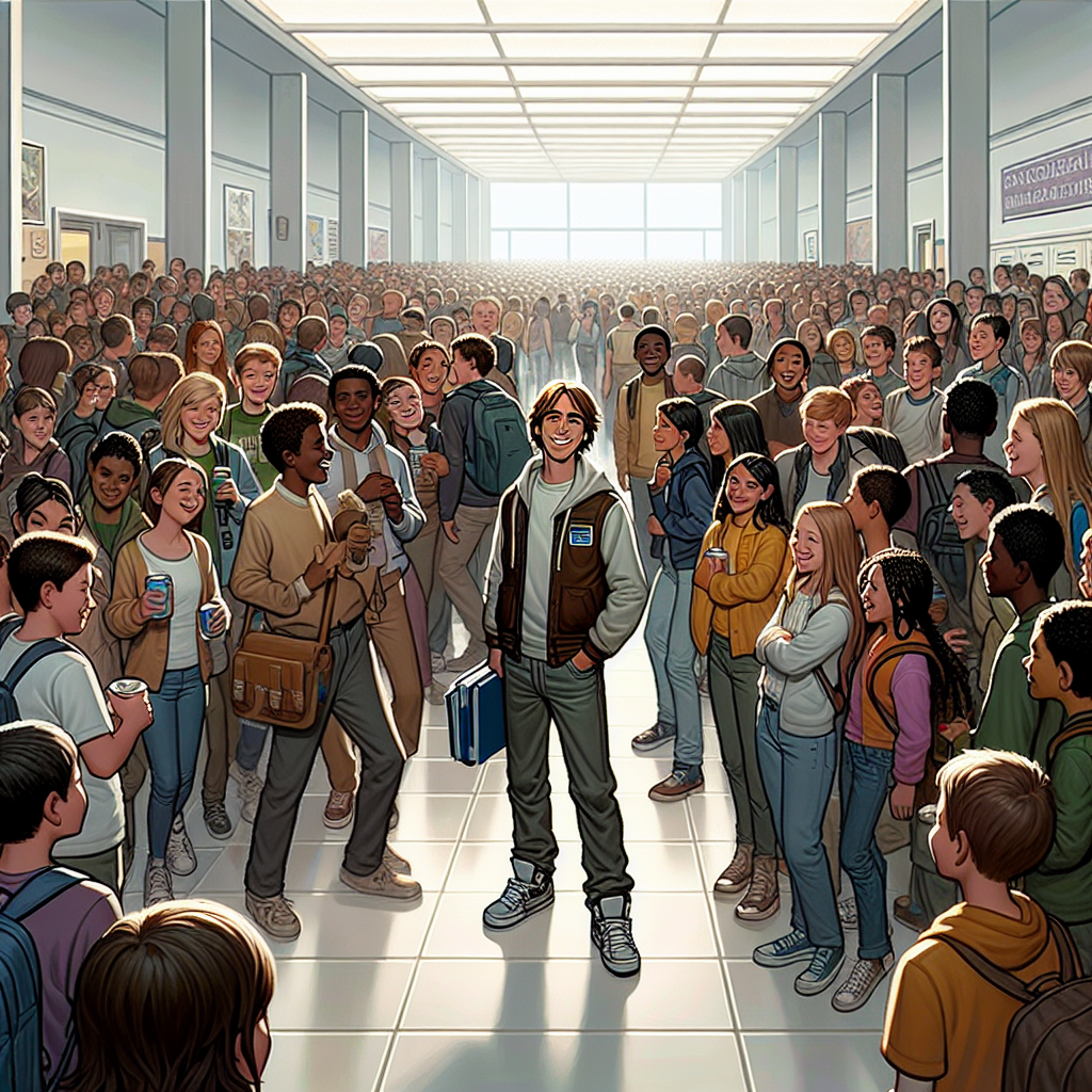 ChatGPT: In a bustling high school hallway, a group of 9th-grade students surrounds a friendly and outgoing student named Jack, smiling and chatting with him. The number of students crowding around him indicates his popularity, while the packed hallway reflects the sheer number of public school students in 9th grade.