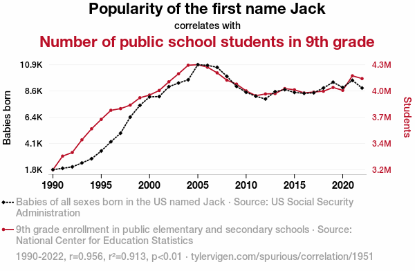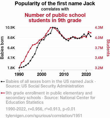 This means 91.3% of the change in the one variable (i.e., Number of public school students in 9th grade) is predictable based on the change in the other (i.e., Popularity of the first name Jack) over the 33 years from 1990 through 2022.
