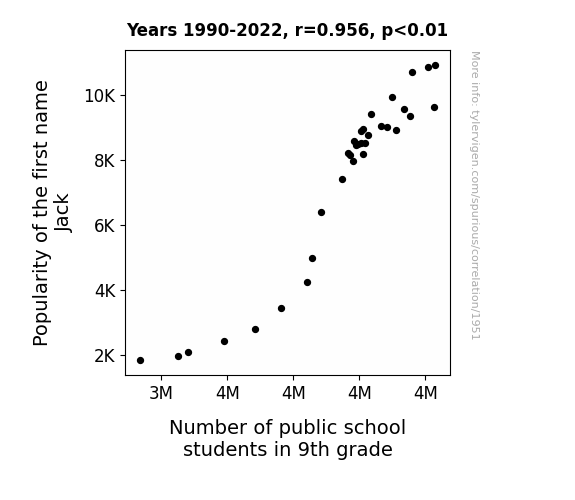 Fig. 1 displays a scatterplot illustrating the strong correlation between the prevalence of the first name Jack and the number of public school students in 9th grade. The figure further bolsters the compelling statistical evidence of this unexpected relationship, proving that there is more to a name than meets the eye.