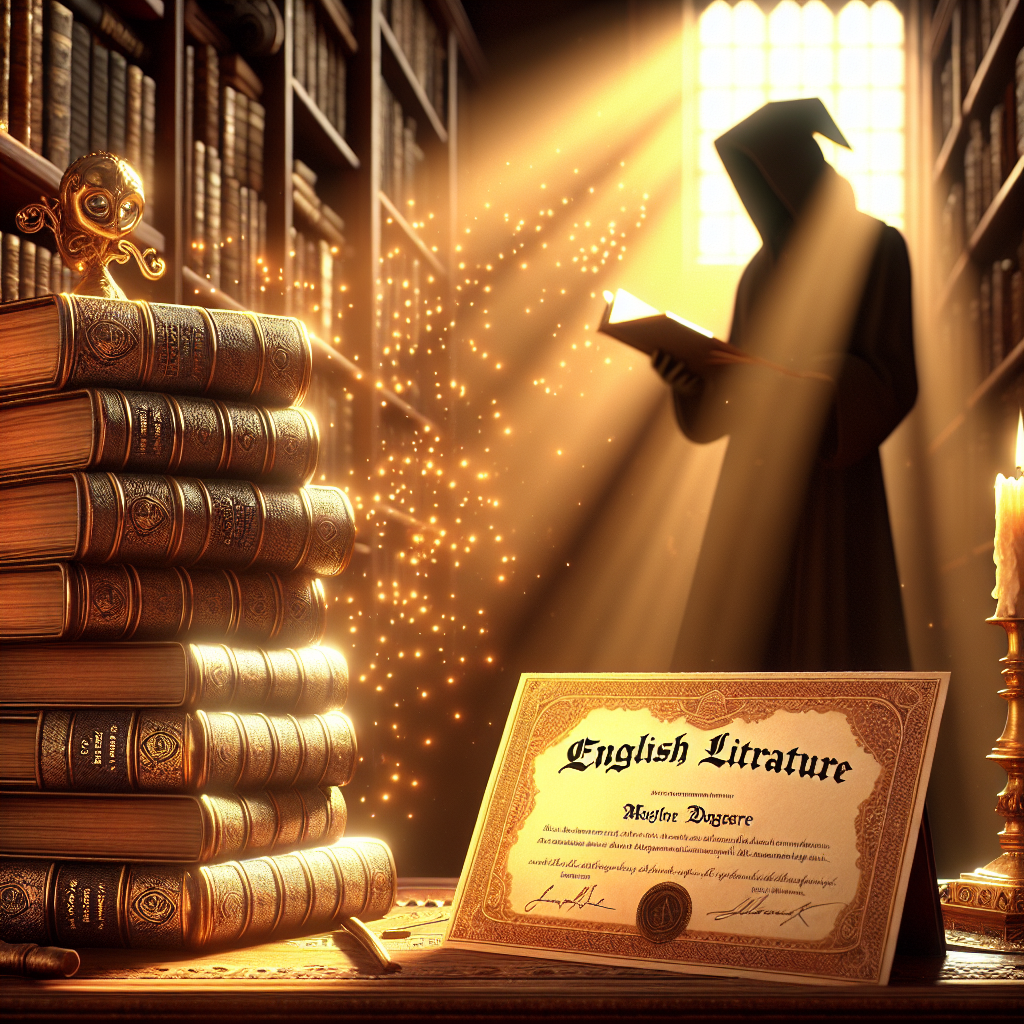 Prompt: [ Whimsical illustration ] In a library filled with warm, golden light, a stack of enchantingly bound books labeled "English Literature" rests on an ornate wooden table, accompanied by a prestigious diploma adorned with "Master's Degree" in elegant script. Radiating an air of tranquility, the scene is magically captured with swirls of sparkling dust dancing in the air. Suddenly, a shadowy figure with a mysterious mask and a crowbar emerges, casting an ominous silhouette amidst the serene surroundings, creating a stark contrast of light and darkness. The depiction should include only scenes, people, and objects, it should not include text or speech bubbles.