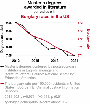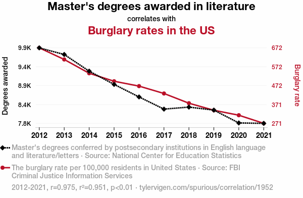 This means 95.1% of the change in the one variable (i.e., Burglary rates in the US) is predictable based on the change in the other (i.e., Master's degrees awarded in literature) over the 10 years from 2012 through 2021.