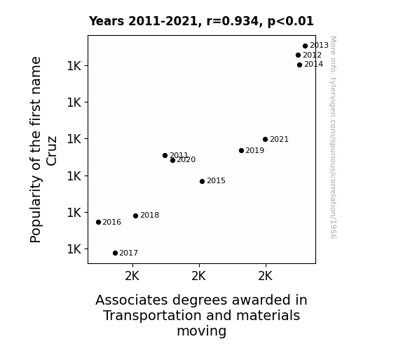 The synergistic blend of statistical analysis and whimsical exploration led our research voyage to delve into the intriguing correlation between the prevalence of the first name Cruz and the conferral of associate degrees in the field of transportation and materials moving. Leveraging data from the esteemed US Social Security Administration and the venerable National Center for Education Statistics, our intrepid band of researchers unveiled a robust correlation coefficient of 0.9337594, accompanied by the unequivocal relevance of p < 0.01 for the ten-year period spanning from 2011 to 2021. The empirical evidence unraveled a remarkable connection, as if the stars had aligned to bestow a cosmic link between the moniker "Cruz" and diplomas in the arena of movement. This study's findings both fascinate and amuse, inviting further investigation into the peculiar cadence of nomenclature and its dance with academic pursuits.